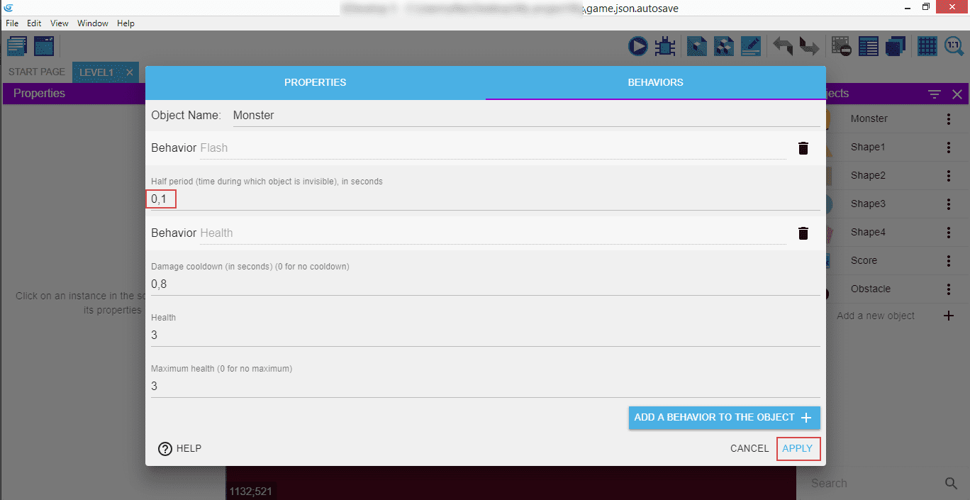 The "Half period" means the time when the object is invisible, and we're going to set it to 0,1 seconds. Below that, you can see the "Health" behavior we entered previously. Click "Apply" to have them saved.