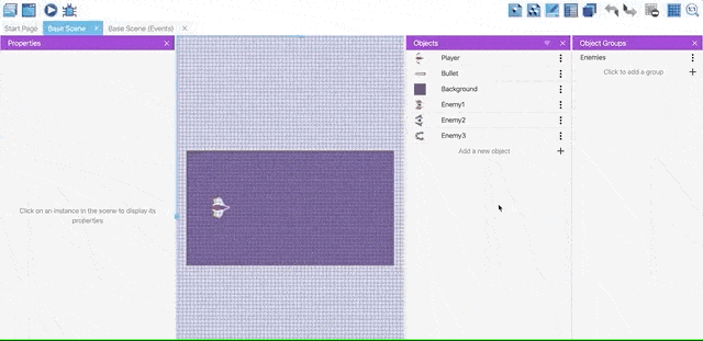 Firstly, we need to add a bullet object. Follow the steps in the previous episode and add a sprite object. Use the name Bullet and add "laser_player.png" image for the object.